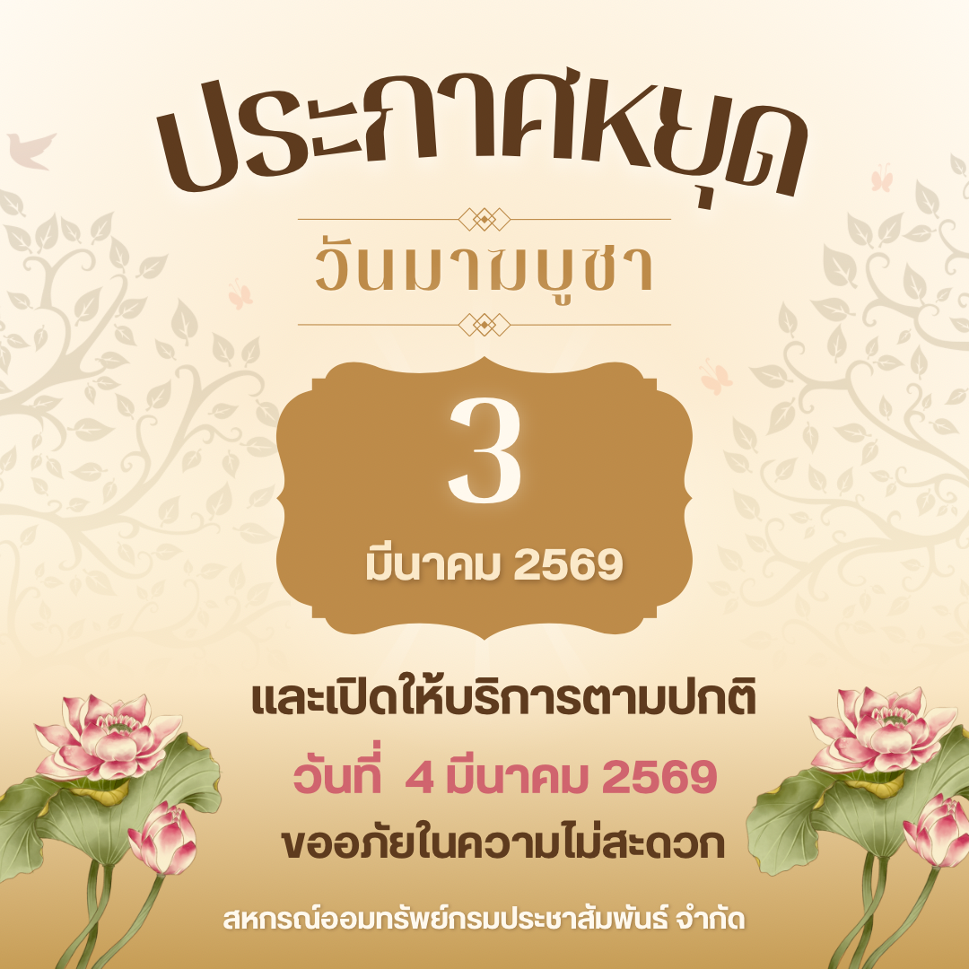 สหกรณ์ฯ หยุด 1 วัน เนื่องในวันมาฆบูชา (3 มี.ค. 2569)